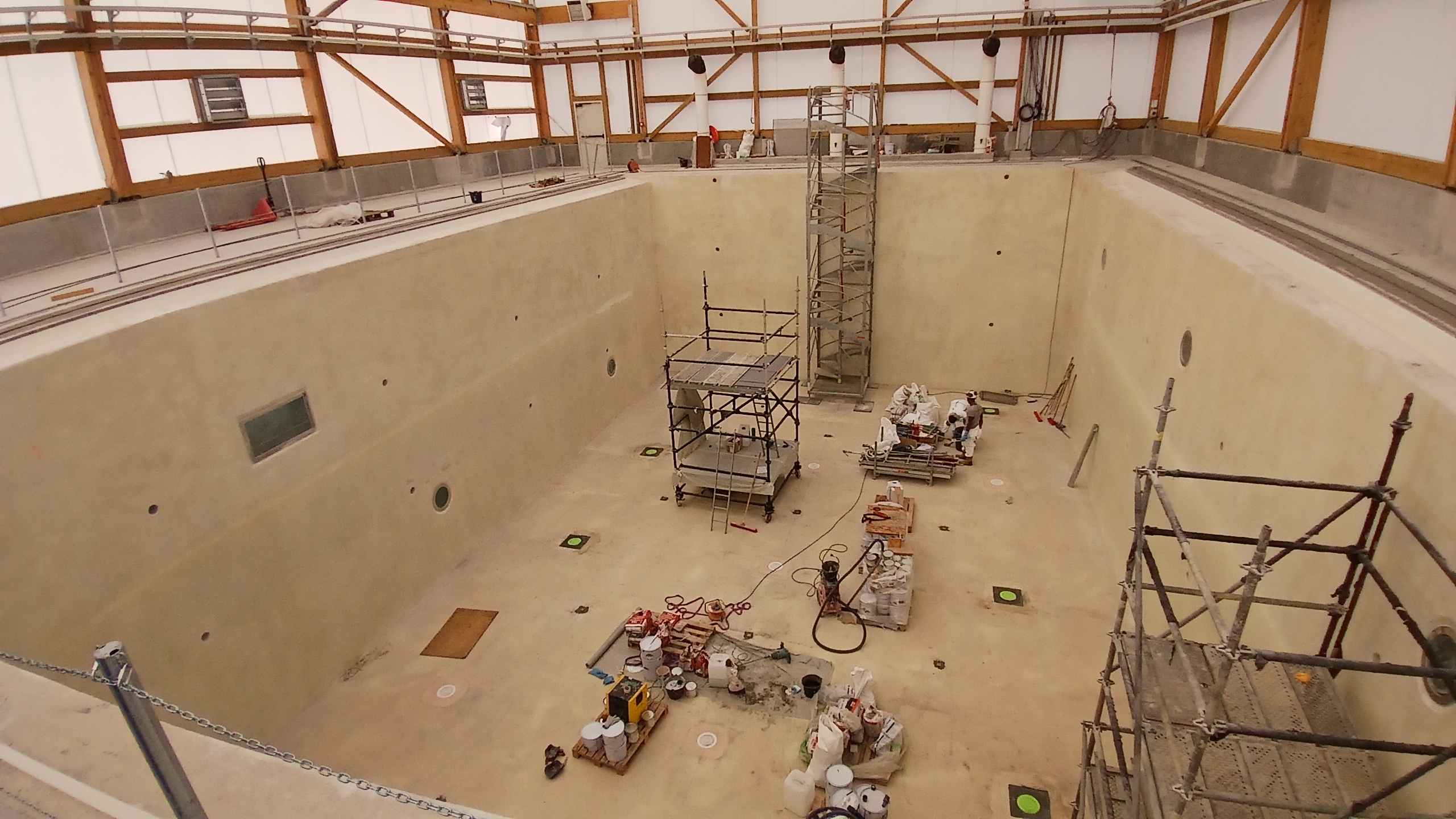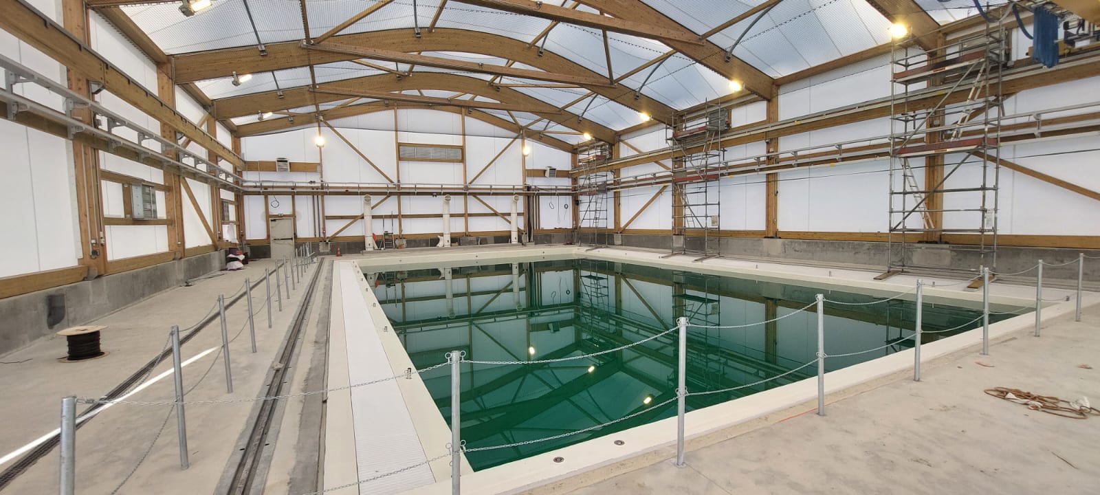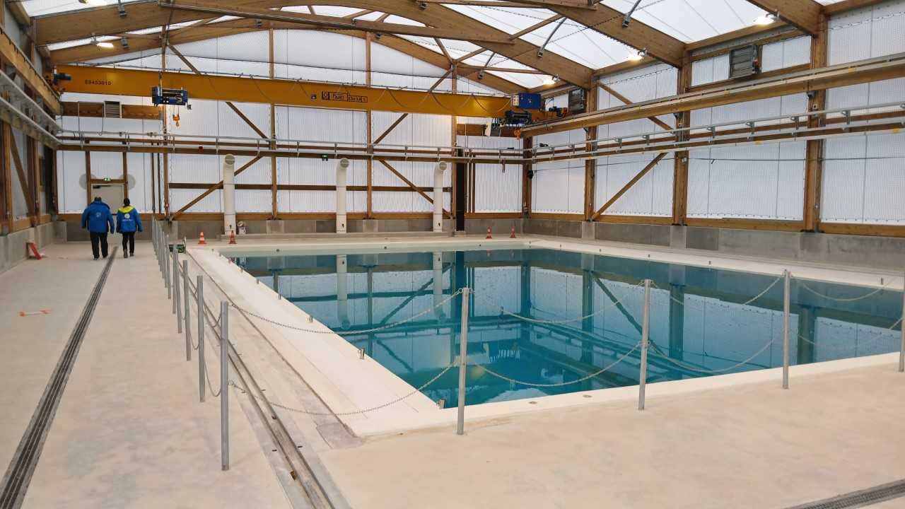 Le bassin de l'ENSTA, dont l'ouverture est prévue pour fin 2025, fait 20m x 12m et 6m de profondeur. Les parois laissent passer le GPS pour les robots de surface et aériens. Une passerelle mobile et un pont roulant facilitent les manipulations.